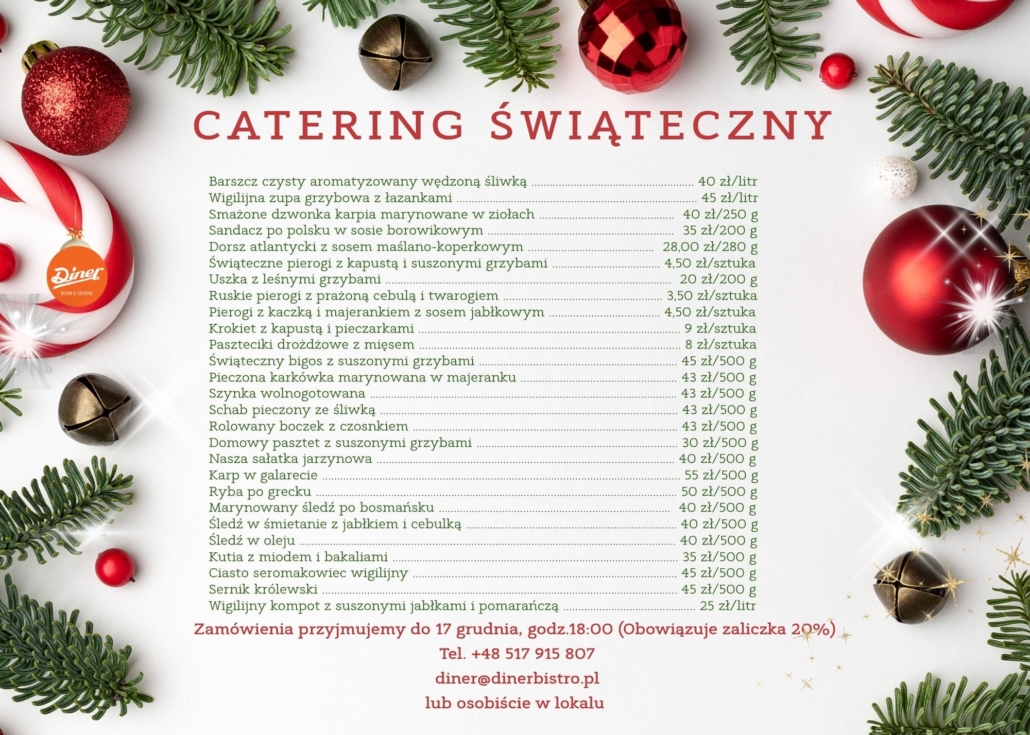 DINER w Olsztynie zaprasza do skorzystania z oferty bożonarodzeniowego cateringu, obejmującej domowe potrawy przygotowane z najwyższej jakości składników.