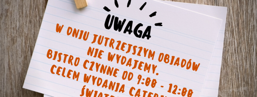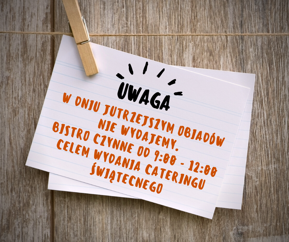 W dniu jutrzejszym 24.12.2025 bistro nie wydaje obiadów. Lokal będzie czynny w godzinach 9:00 -12:00 wyłącznie w celu wydania cateringu świątecznego.