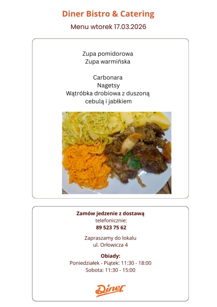 Szukasz sprawdzonego miejsca na domowy obiad w Olsztynie? W Diner Bistro & Catering codziennie przygotowujemy świeże, sycące dania, które możesz zjeść na miejscu, zabrać na wynos lub zamówić z dostawą.